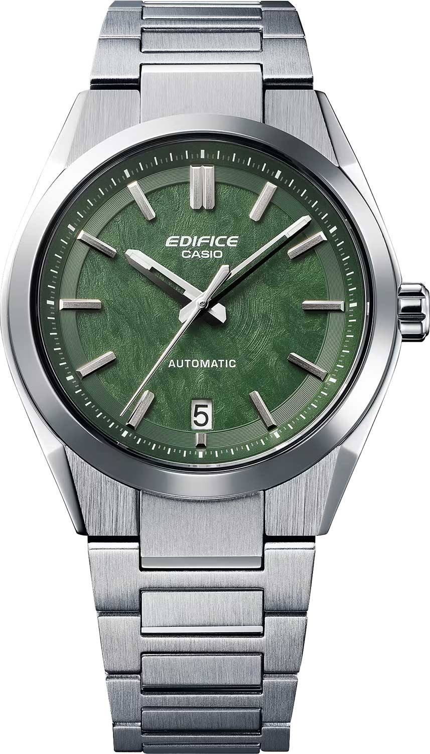 Edifice. Мужские часы. В механизме 24 камня, частота 21600 полуколебаний в час. Запас хода 40 часов. Возможность ручного завода. Защищены от магнитных полей. Циферблат с текстурой кованого карбона защищен прочным сапфировым стеклом. Метки в виде штрихов. Окошко даты находится в положении 6 часов. Прозрачная задняя крышка с винтовым фиксатором. Литой браслет с тройной раскладывающейся застежкой, расстегиваемой одним касанием.
