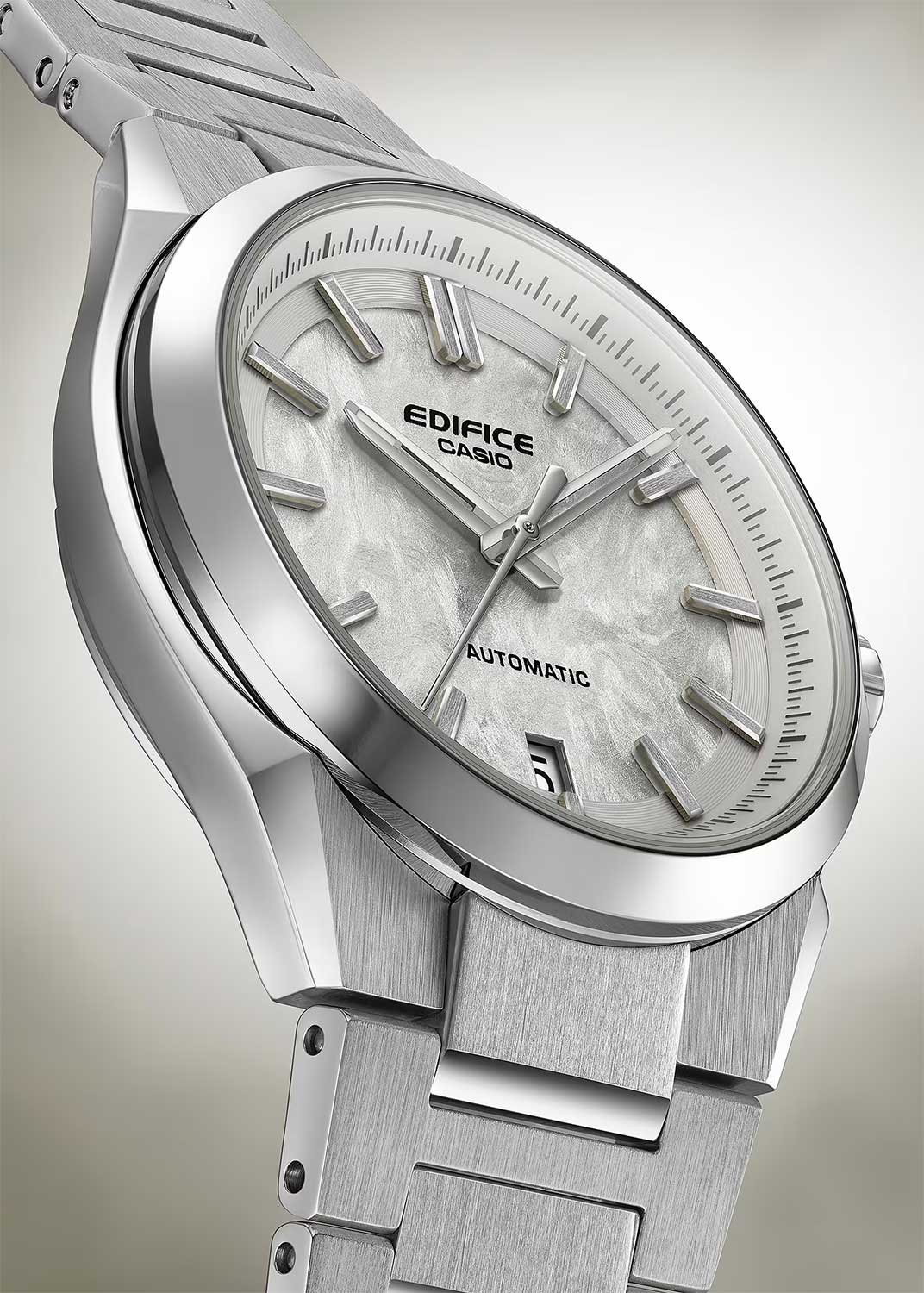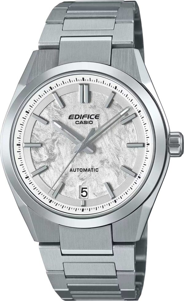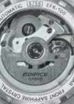 Edifice. Мужские часы. В механизме 24 камня, частота 21600 полуколебаний в час. Запас хода 40 часов. Возможность ручного завода. Защищены от магнитных полей. Циферблат с текстурой кованого карбона защищен прочным сапфировым стеклом. Метки в виде штрихов. Окошко даты находится в положении 6 часов. Прозрачная задняя крышка с винтовым фиксатором. Литой браслет с тройной раскладывающейся застежкой, расстегиваемой одним касанием.