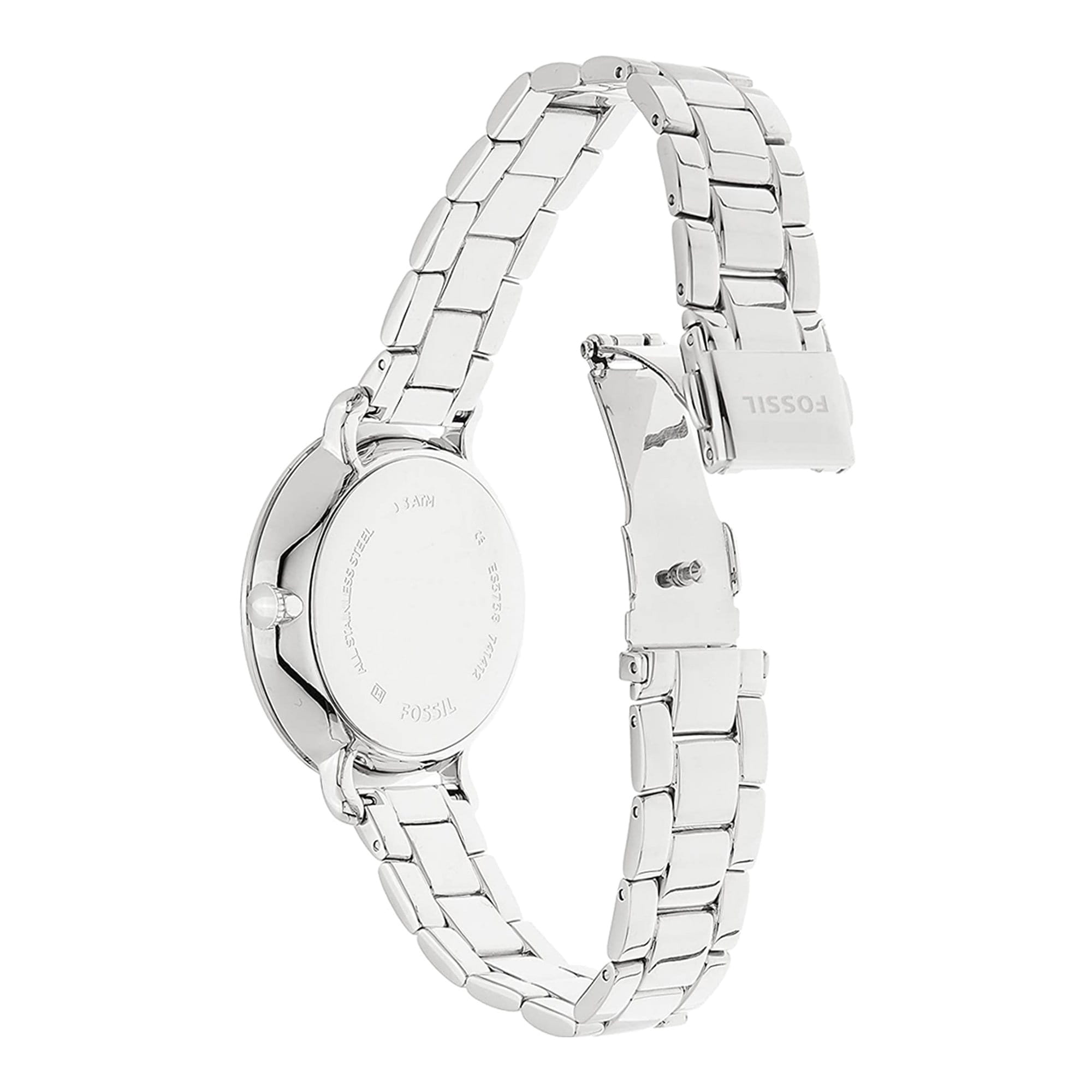 Женские наручные часы Fossil ES3738. Корпус часов изготовлен из нержавеющей стали. Минеральное стекло устойчивое к появлению царапин, обладающее высокой прозрачностью. Стальной браслет на раскладной застёжке. Класс водозащиты: 50 метров, позволит защитить корпус от случайных брызг или капель дождя.