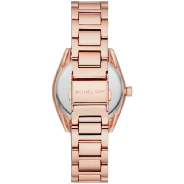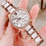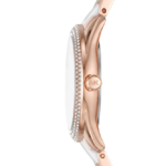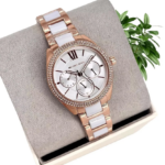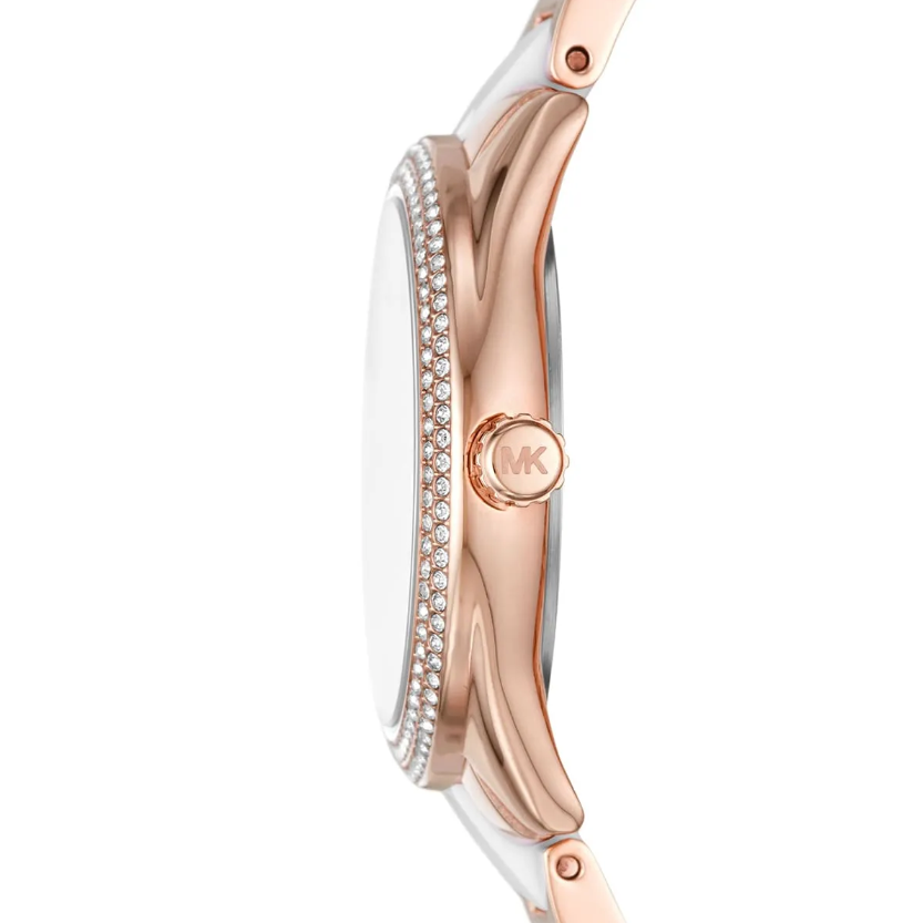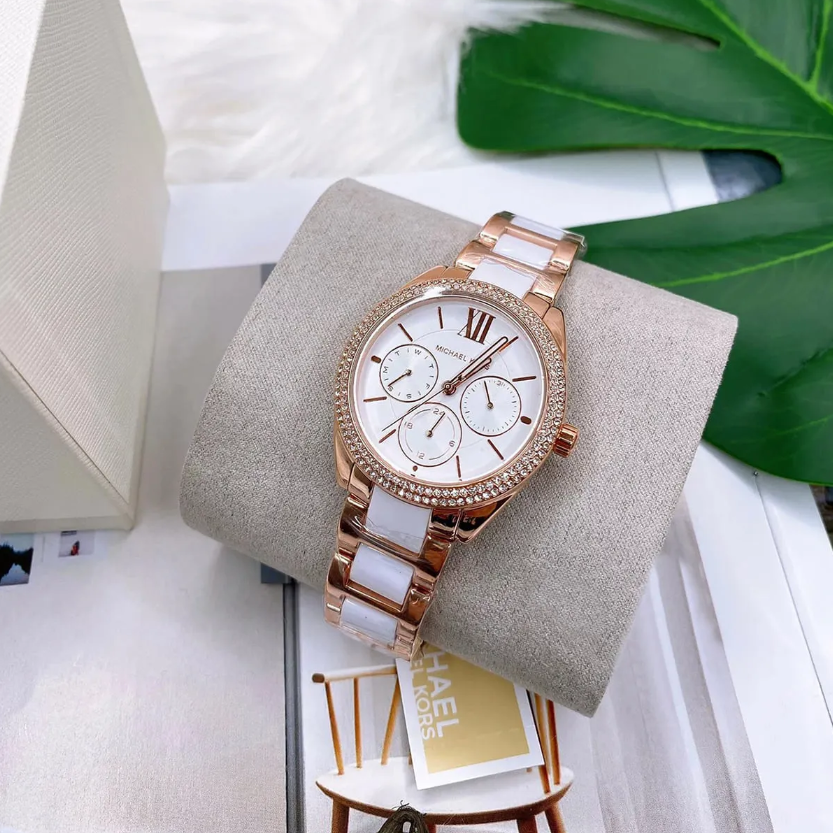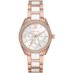 Часы Michael Kors Janelle диаметром 36 мм имеют белый циферблат с индексами цвета розового золота, многофункциональный механизм и браслет цвета розового золота с центральными звеньями из белого ацетата.