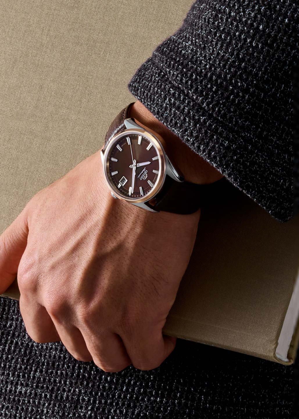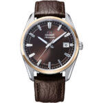 Мужские механические часы с автоподзаводом (с возможностью ручного подзавода). Калибр механизма F6722 на 22 камнях. Частота 21 600 полуколебаний в час. Центральные часовая, минутная и секундная стрелки. Апертура даты в позиции 3 часов. Коричневый циферблат. Круглый корпус выполнен из нержавеющей стали с частичным IP покрытием цвета желтого золота. Диаметр корпуса составляет 38,5 мм. Коричневый кожаный ремешок, раскладывающаяся застежка. Устойчивое к возникновению царапин сапфировое стекло. Прозрачная задняя крышка. Водостойкость WR 50 (мытье рук, дождь).