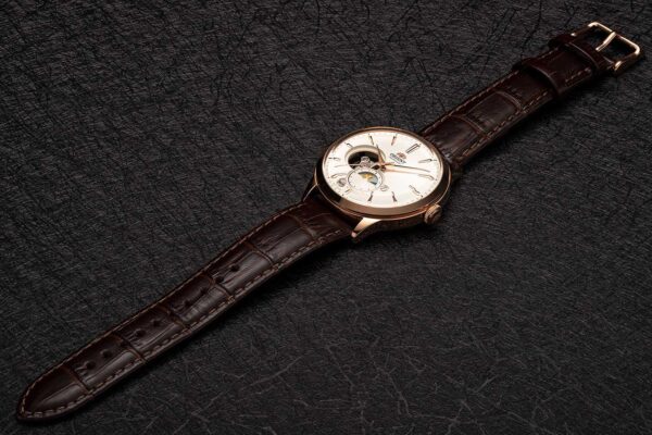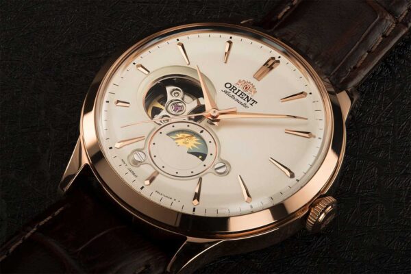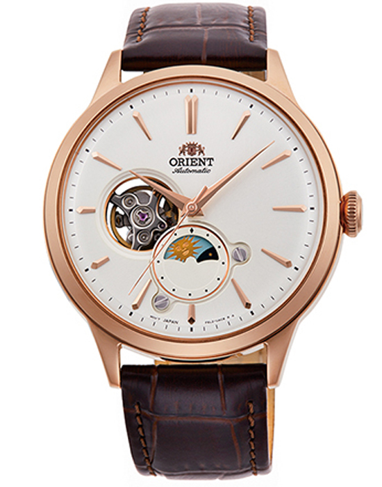 Часы Orient RA-AS0102S из коллекции Sun & Moon — это утончённое сочетание классики и современных технологий. Корпус диаметром 42 мм выполнен из нержавеющей стали с изысканным PVD-покрытием розового золота. Циферблат белого цвета украшен , отображающим смену времени суток, а также функцией , позволяющей наблюдать за работой механизма. Часы оснащены автоматическим механизмом Orient Calibre F6L24 с возможностью ручного завода и функцией остановки секундной стрелки. Запас хода составляет до 40 часов, обеспечивая бесперебойную работу. Коричневый кожаный ремешок с классической застёжкой подчёркивает элегантный стиль и обеспечивает комфортное ношение. Минеральное стекло защищает циферблат от мелких повреждений, а водонепроницаемость до 30 метров делает часы подходящими для повседневного использования. Orient RA-AS0102S — это идеальный выбор для тех, кто ценит японское качество, изысканный дизайн и надёжность.