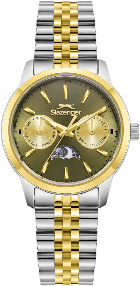 Стильные женские часы Slazenger с дополнительным отображением на малых циферблатах даты и дня недели. Присутствует индикатор день/ночь. Браслет с раскладывающейся застежкой. Вес часов 76 грамм.