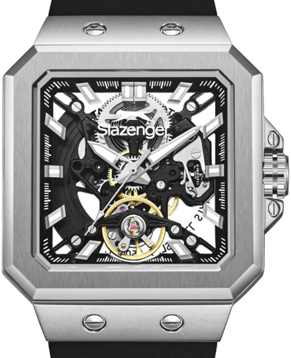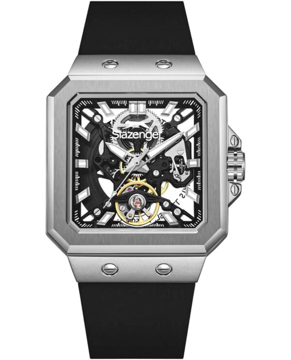 Мужские механические часы с автоподзаводом Slazenger — это выразительный и функциональный аксессуар. Корпус размером 40×51 мм и толщиной 14 мм выполнен из нержавеющей стали 316L. Циферблат чёрного цвета скелетонизирован, что позволяет наблюдать за работой механизма. Циферблат защищён минеральным стеклом. Стрелки и метки с люминесцентным покрытием, обеспечивающим хорошую читаемость в темноте. Часы оснащены силиконовым ремешком с стандартной застёжкой. Водонепроницаемость 100 м позволяет использовать часы для плавания и повседневного ношения.
