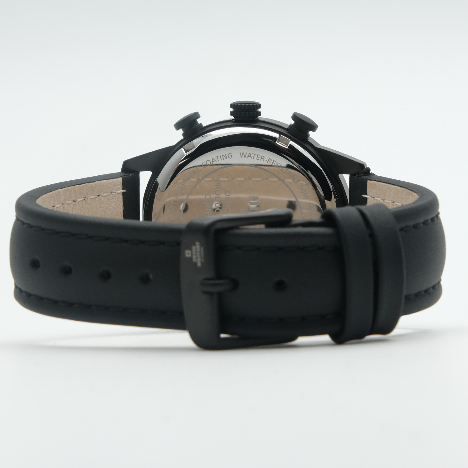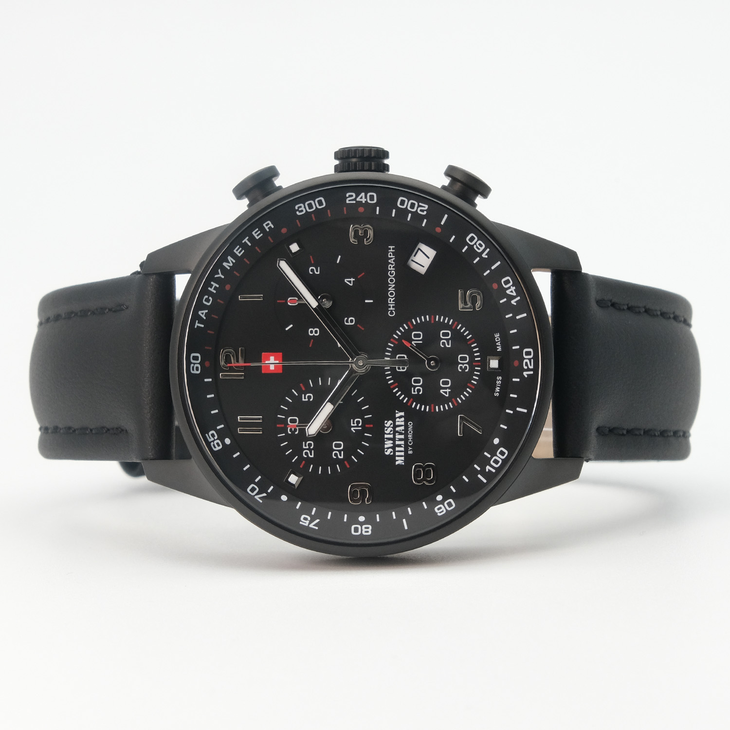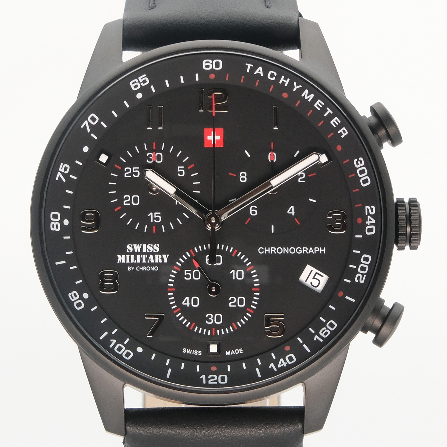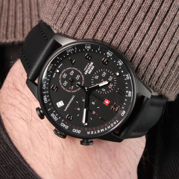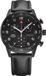 Надежный и функциональный кварцевый хронограф станет прекрасным аксессуаром для активных и целеустремленных мужчин. Центральные часовая, минутная и секундная стрелки. Индикация даты на позиции четырех часов. Тахиметрическая шкала. Хронограф. Стрелки и метки с люминесцентным покрытием. Водозащита WR 50. Корпус выполнен из нержавеющей стали с PVD покрытием черного цвета. Диаметр корпуса 41 мм. Устойчивое к мелким механическим повреждениям минеральное стекло. Завинчивающаяся задняя крышка. Циферблат черного цвета. Кожаный ремешок черного цвета. Классическая застежка выполнена из нержавеющей стали с PVD покрытием черного цвета.