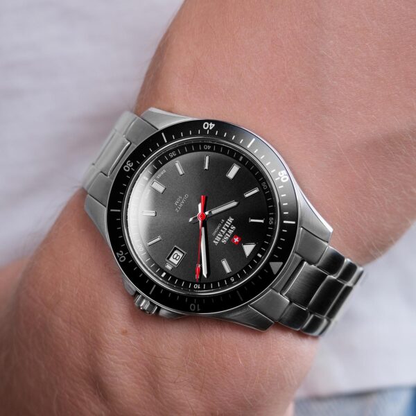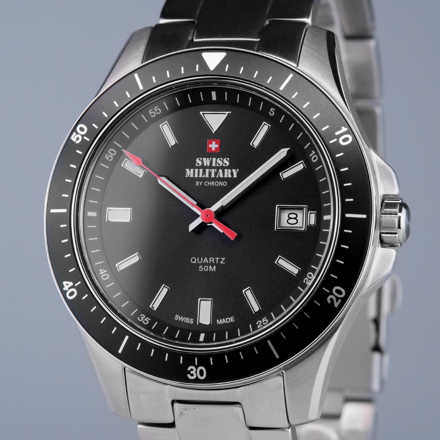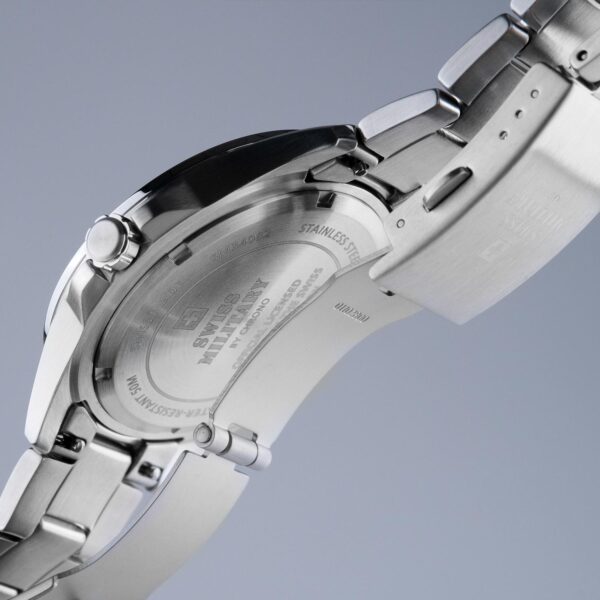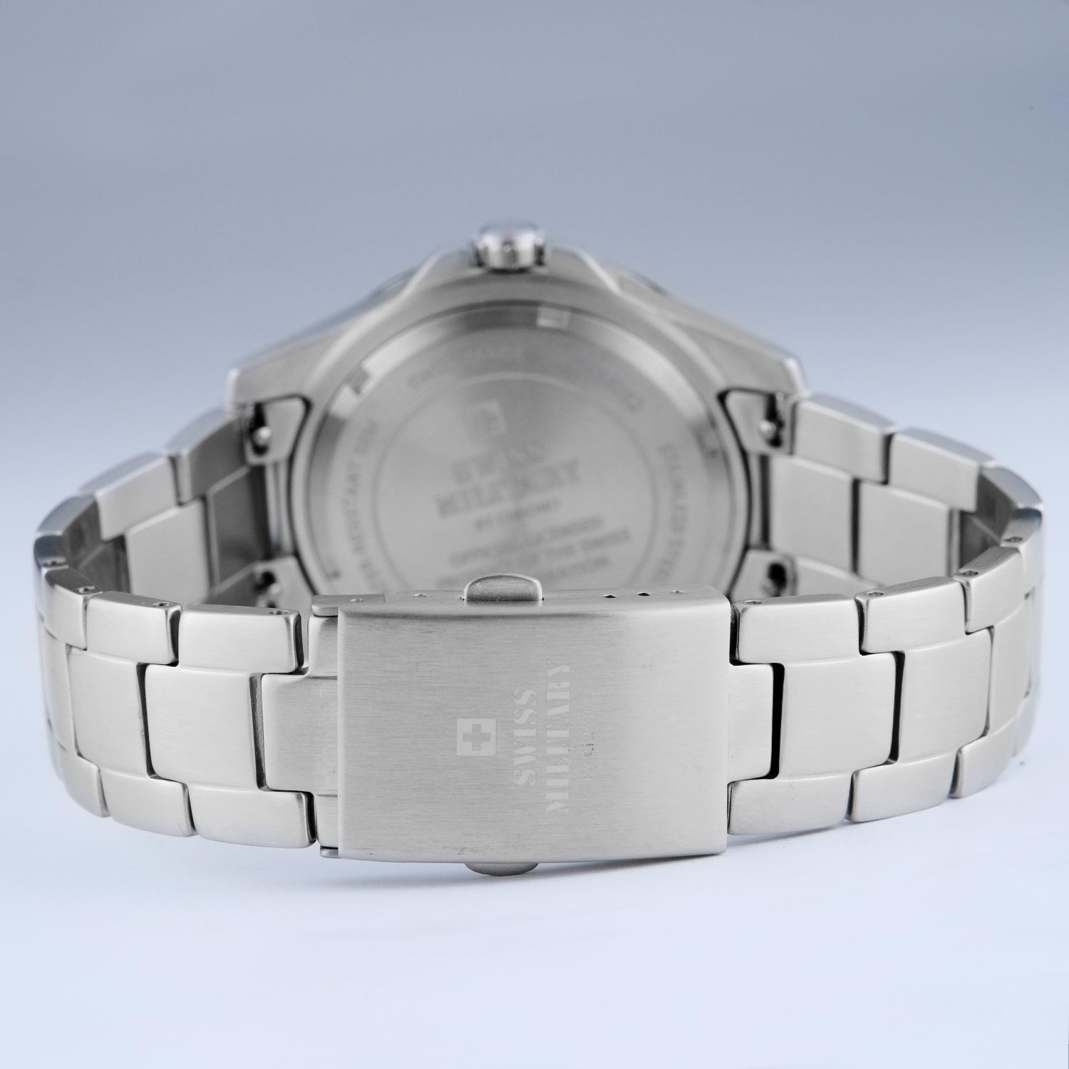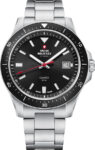 Кварцевые часы. Водостойкость WR 50. Центральные часовая, минутная и секундная стрелки. Индикация даты на позиции трех часов. Стрелки и метки с люминесцентным покрытием. Черный циферблат с часовыми индексами в виде штрихов и цифр. Корпус выполнен из нержавеющей стали. Диаметр корпуса 42 мм. Устойчивое к возникновению царапин минеральное стекло. Заводная головка с защитой. Браслет выполнен из нержавеющей стали.