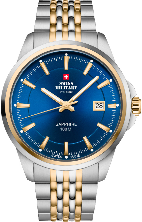 Кварцевые часы. Водостойкость WR 100 (плавание без погружения). Центральные часовая, минутная и секундная стрелки. Индикация даты. Стрелки и метки с люминесцентным покрытием. Циферблат с часовыми индексами в виде штрихов. Корпус выполнен из нержавеющей стали с частичным PVD покрытием. Диаметр корпуса 40 мм, толщина 9 мм. Устойчивое к возникновению мелких механических повреждений сапфировое стекло. Браслет выполнен из нержавеющей стали с частичным PVD покрытием.