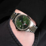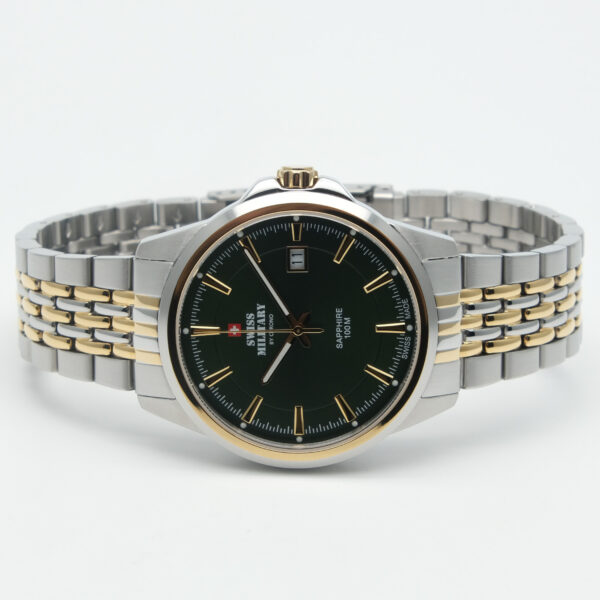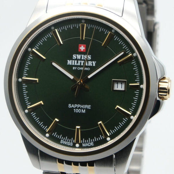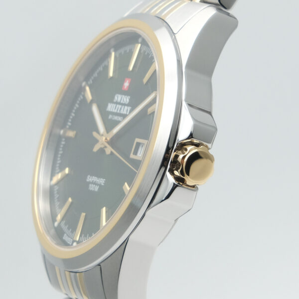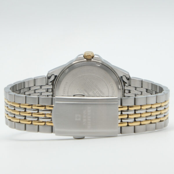Кварцевые часы. Водостойкость WR 100 (плавание без погружения). Центральные часовая, минутная и секундная стрелки. Индикация даты. Стрелки и метки с люминесцентным покрытием. Циферблат с часовыми индексами в виде штрихов. Корпус выполнен из нержавеющей стали с частичным PVD покрытием. Диаметр корпуса 40 мм, толщина 9 мм. Устойчивое к возникновению мелких механических повреждений сапфировое стекло. Браслет выполнен из нержавеющей стали с частичным PVD покрытием.